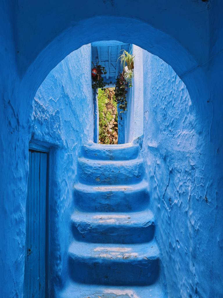 Encajada entre las montañas del Rif, Chauen enamora con sus tonos azules que lo tiñen todo: paredes, puertas y callejuelas empedradas. Fundada en el siglo XV, fue refugio de andalusíes y judíos, quienes dejaron su impronta en la arquitectura y el espíritu de la ciudad.